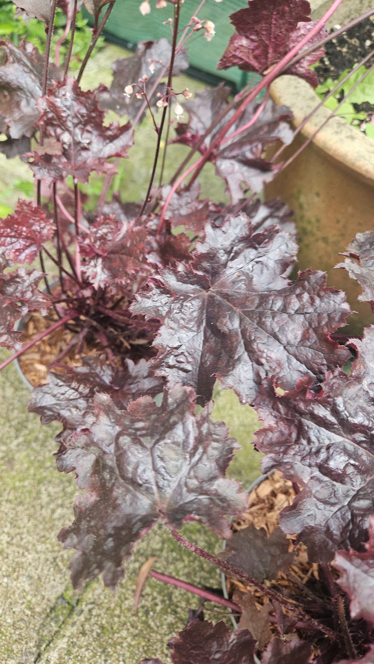 Heuchera ‘Black Beauty’ is a dramatic perennial known for its deep, rich, nearly black foliage, which features a subtle sheen that shimmers in the light. The dark leaves are finely cut, giving the plant a delicate, lace-like texture, while the contrasting silvery undersides add dimension and interest. In late spring to early summer, slender stems bear small, bell-shaped white or pale pink flowers, providing a soft contrast against the dark foliage. ‘Black Beauty’ thrives in partial to full shade and well-drained, moist soil, making it ideal for shaded borders, woodland gardens, or containers. Its bold, striking colour offers year-round appeal, providing a dramatic focal point even in the darker months. This low-maintenance variety attracts pollinators and pairs beautifully with both bright and muted plantings, making it a versatile and eye-catching addition to any garden.