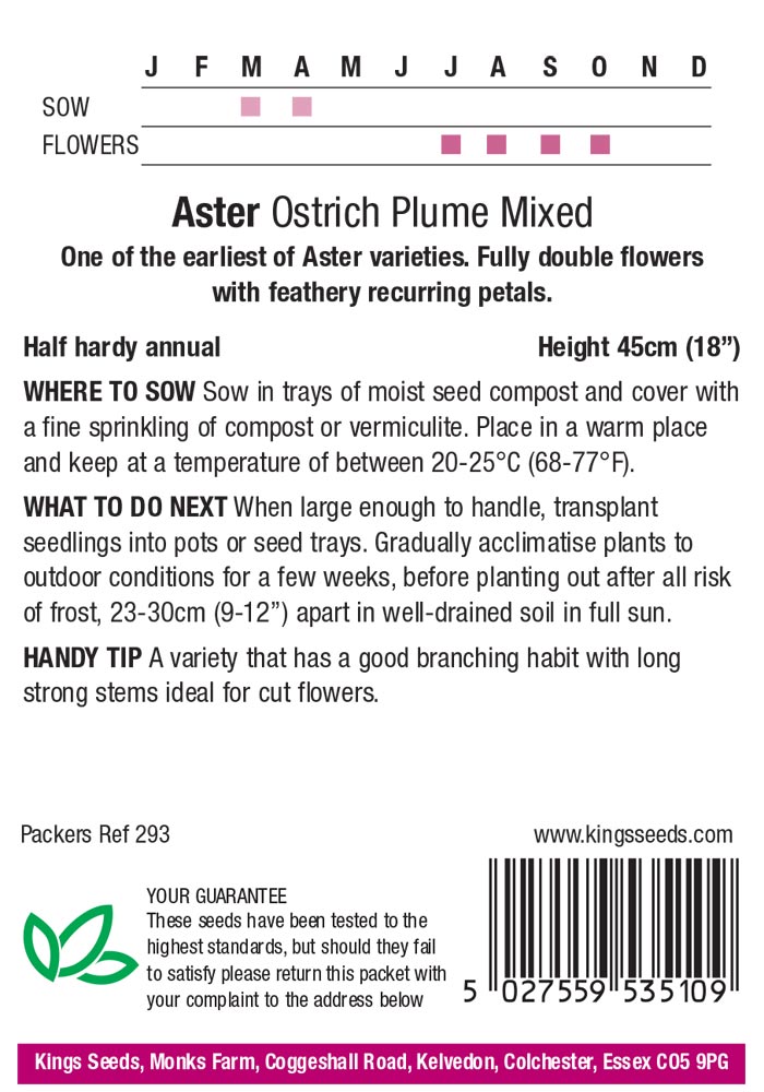 Ostrich Plume Aster produces stunning and very large double blooms with feathered re-curved petals. It has a branching habit that makes it prolific and makes a gorgeous cut flower for your home.The plant will grow to a height of approximately 45cm.