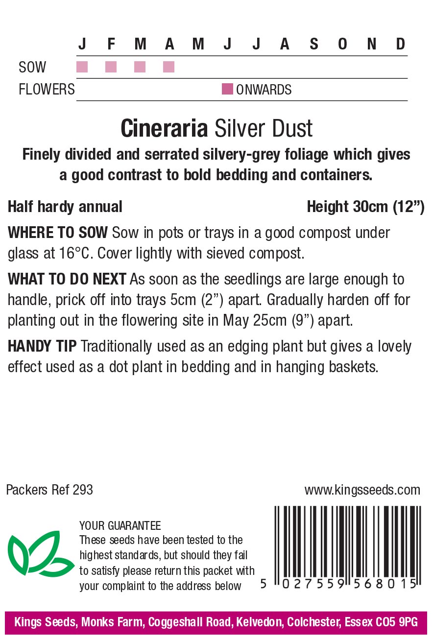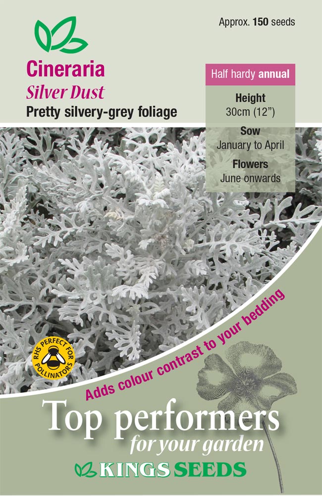 Cineraria Maritime Silver Dust is a dwarf strain of this popular edging and contrast plant that has the most beautiful lace like and finely cut silver foliage. It is an ideal choice for the edges because it grows to a tiny height of approximately 30cm.