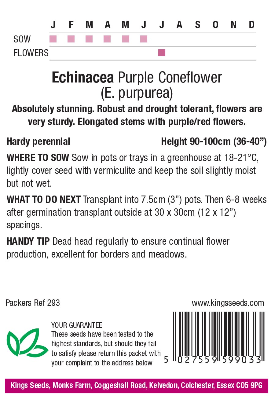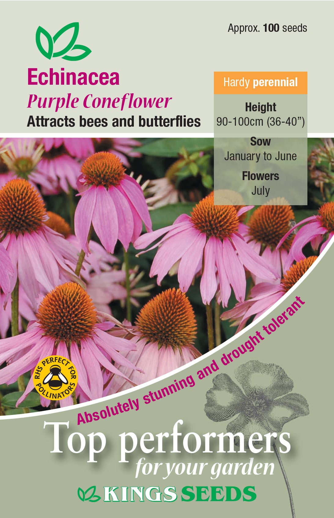Echinacea Purpurea (Purple Coneflower) makes for a splendid sight when planted in clumps. The blooms produced are large purple red flowers with orange centres. The flowers are attractive to bees and other pollinators. This drought tolerant variety makes for a lovely cut flower and flowers from June to September at an approximate height of 90-100cm.