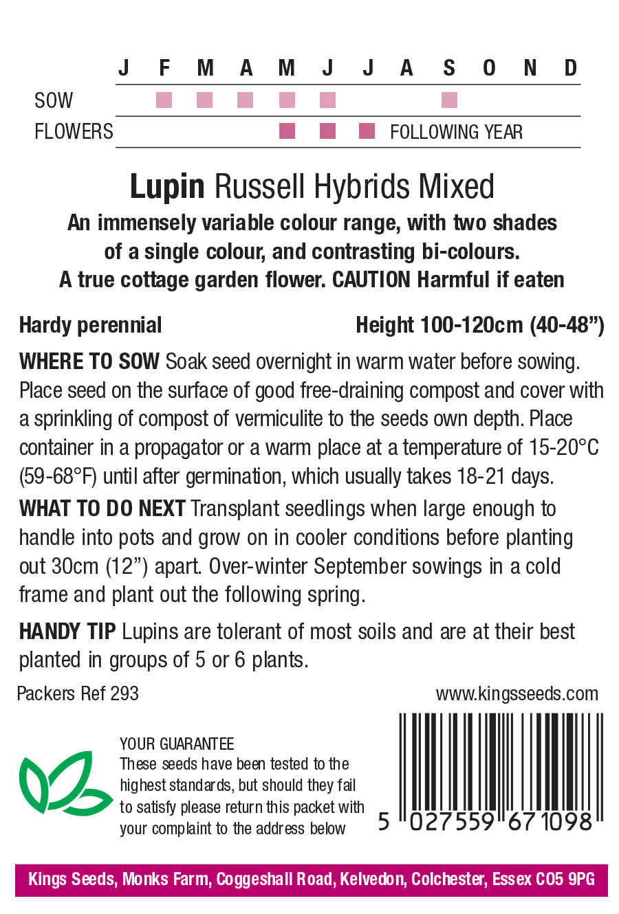 These mixed seeds have an immensely variable colour range, with two shades of a single colour and contrasting bi-colours. Lupins are a true cottage garden flower. There is little to rival a mass planting of lupins with their tall spikes glowing with colour in May and June. Growing Lupins from seed is a much more cost effective way to grow these stunning flowers, when compared to buying them as established plants!