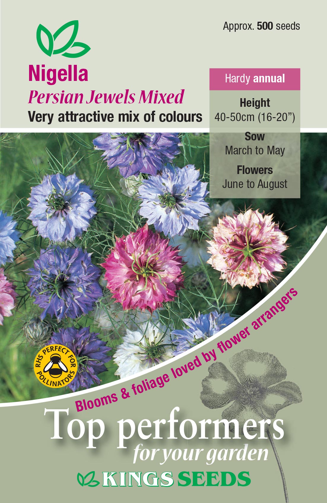 Has all the delights of bedding, drying and cutting use but in an attractive range of colours from pink, purple, lilac, blue and white. Also known as Love in the Mist and loved by flower arrangers.