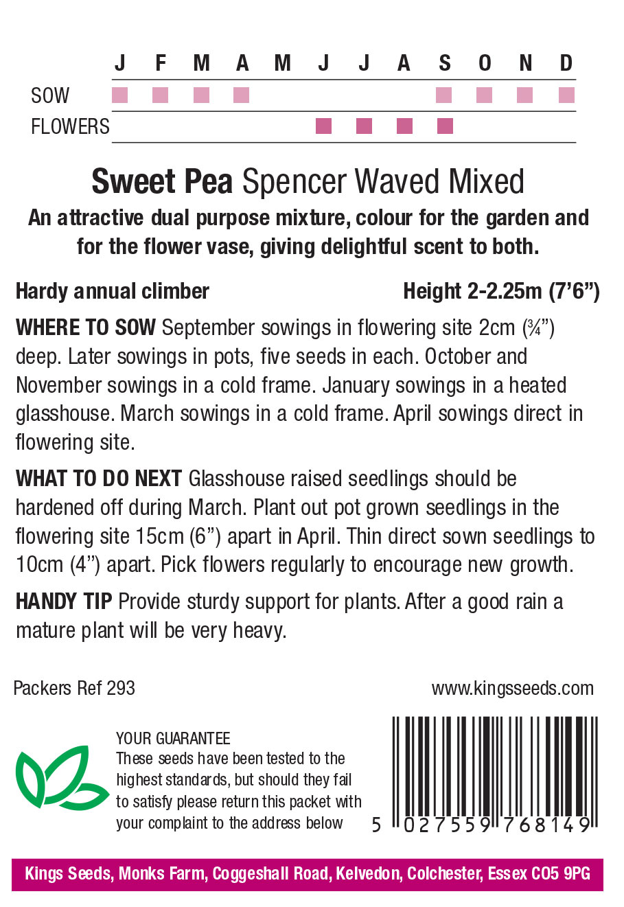 Spencer Waved Mix is a blended mixture of outstanding quality. Made up of separate coloured Sweet Peas chosen for their garden performance, colour and delightful scent. Grown here on our premises at Monks Farm, Kelvedon.