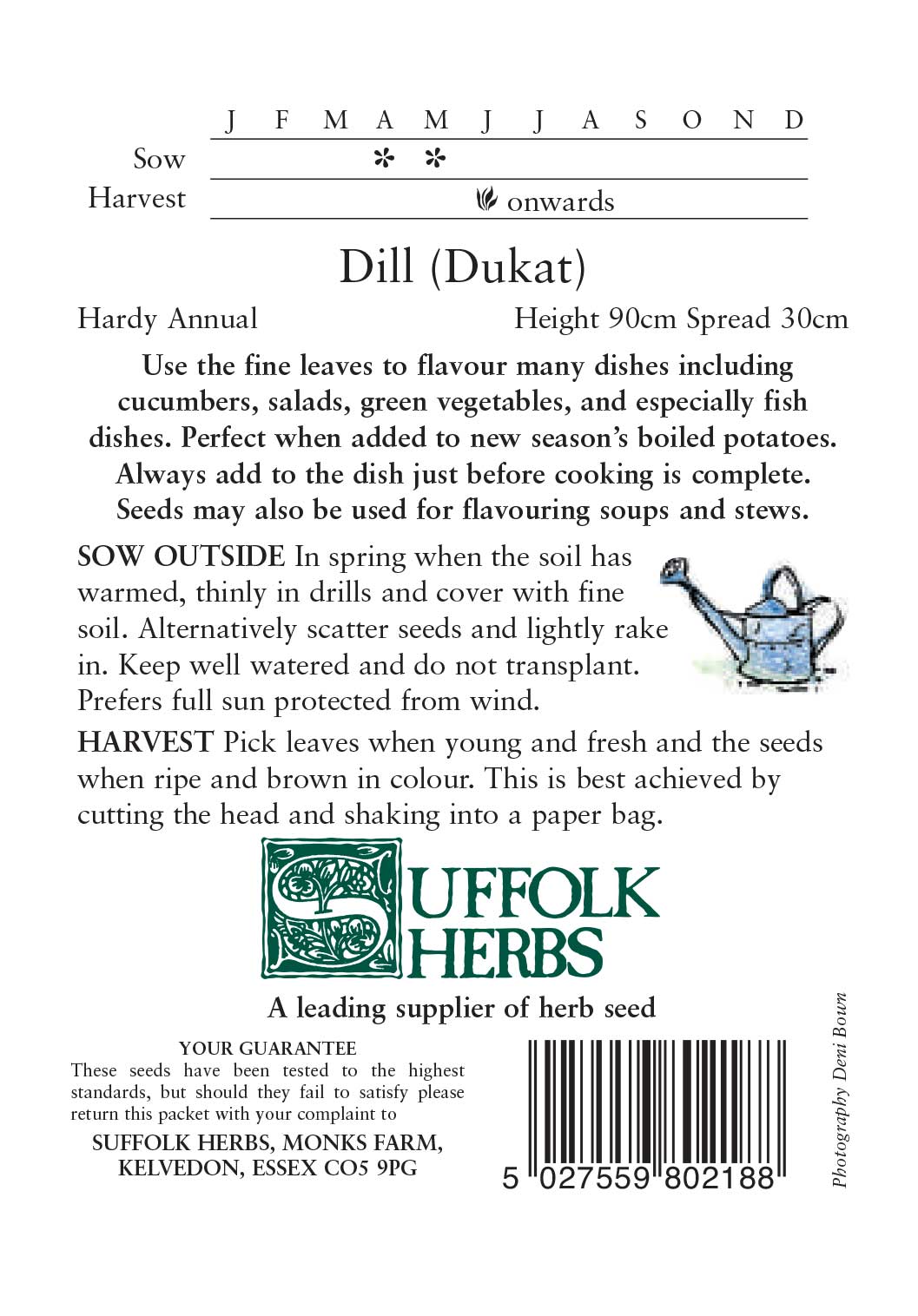 Dill is a decorative plant with feathery foliage and yellow flowers. Can be planted in a flower border or a herb garden, and usually grown in masses.. Dill seeds are a common ingredient in pickles and sauces. It goes perfectly with fish dishes and can be mixed with mayonnaise to create a really tasty addition to a sandwich. Dill seed is also good for digestion.