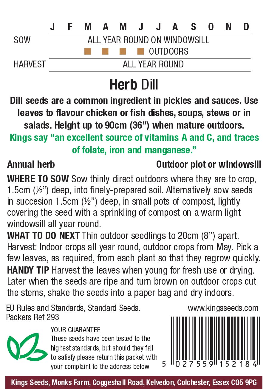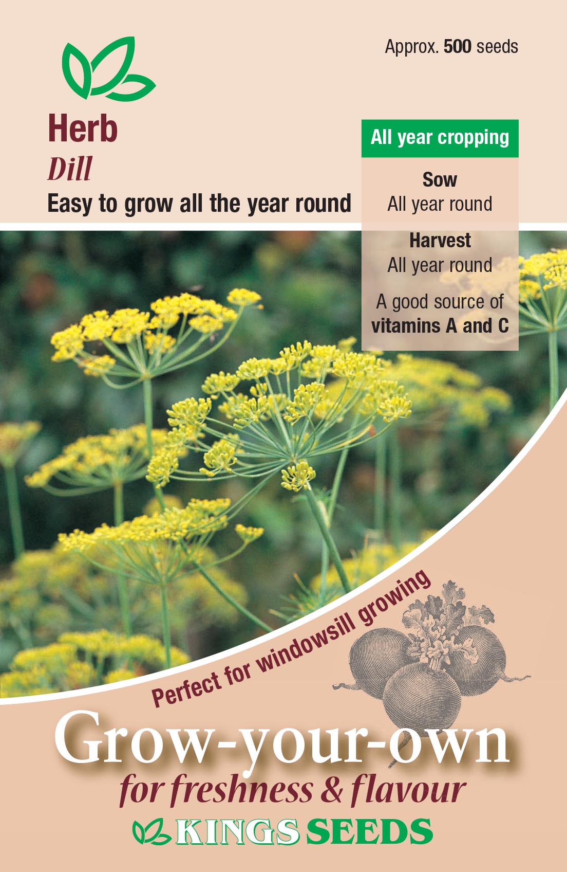 Dill is a decorative plant with feathery foliage and yellow flowers. Can be planted in a flower border or a herb garden, and usually grown in masses.. Dill seeds are a common ingredient in pickles and sauces. It goes perfectly with fish dishes and can be mixed with mayonnaise to create a really tasty addition to a sandwich. Dill seed is also good for digestion.