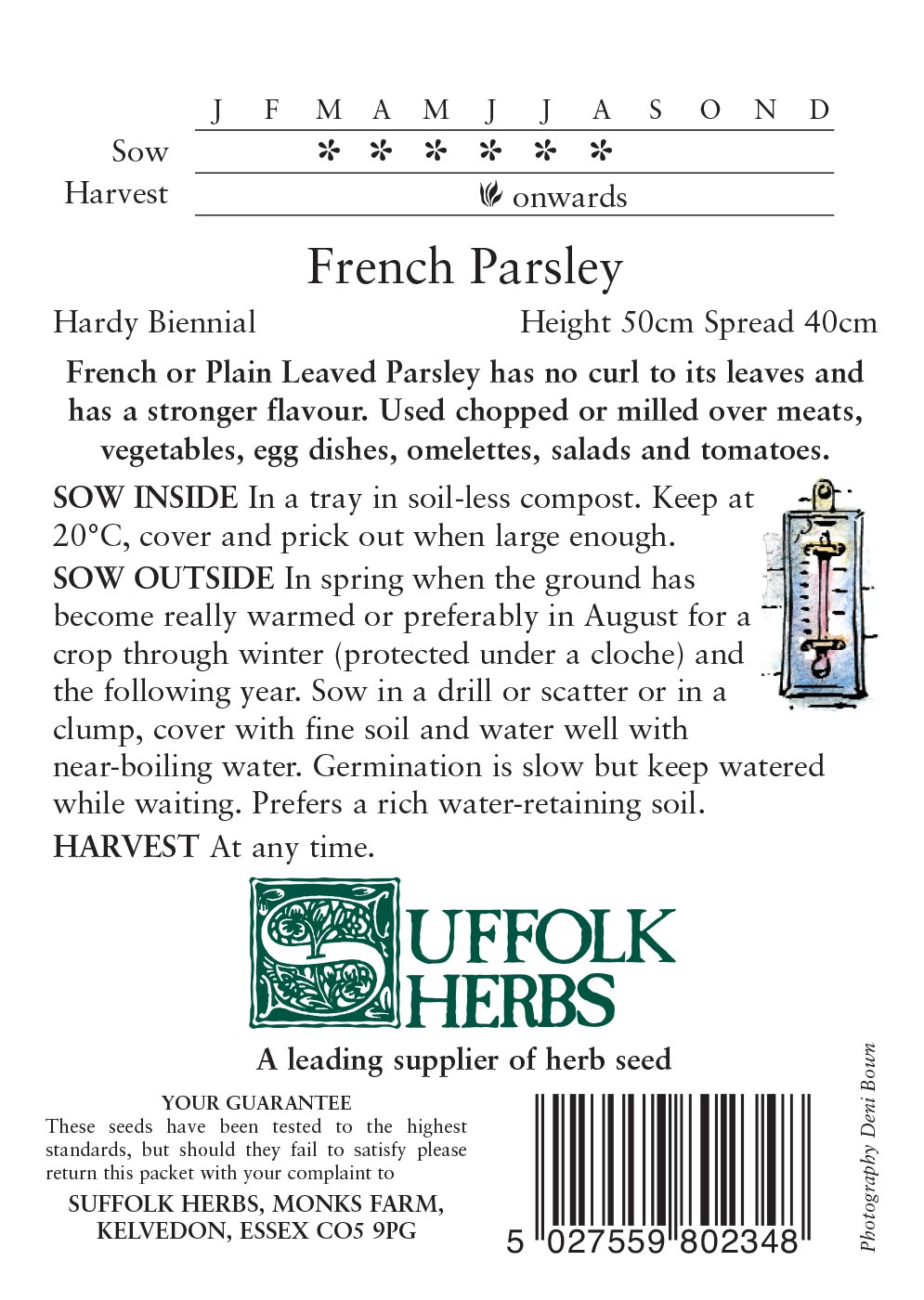 A must for the herb garden, this pretty, flat-leaved parsley can be used to enhance the favour of a wide range of dishes, as well as making a wonderful garnish. Tolerant of a little light shade, they are happiest in a sunny spot with freely draining soil. Forming relatively compact clumps, the rich green leaves have a sweet but pungent flavour that will keep its flavour well when cooked.