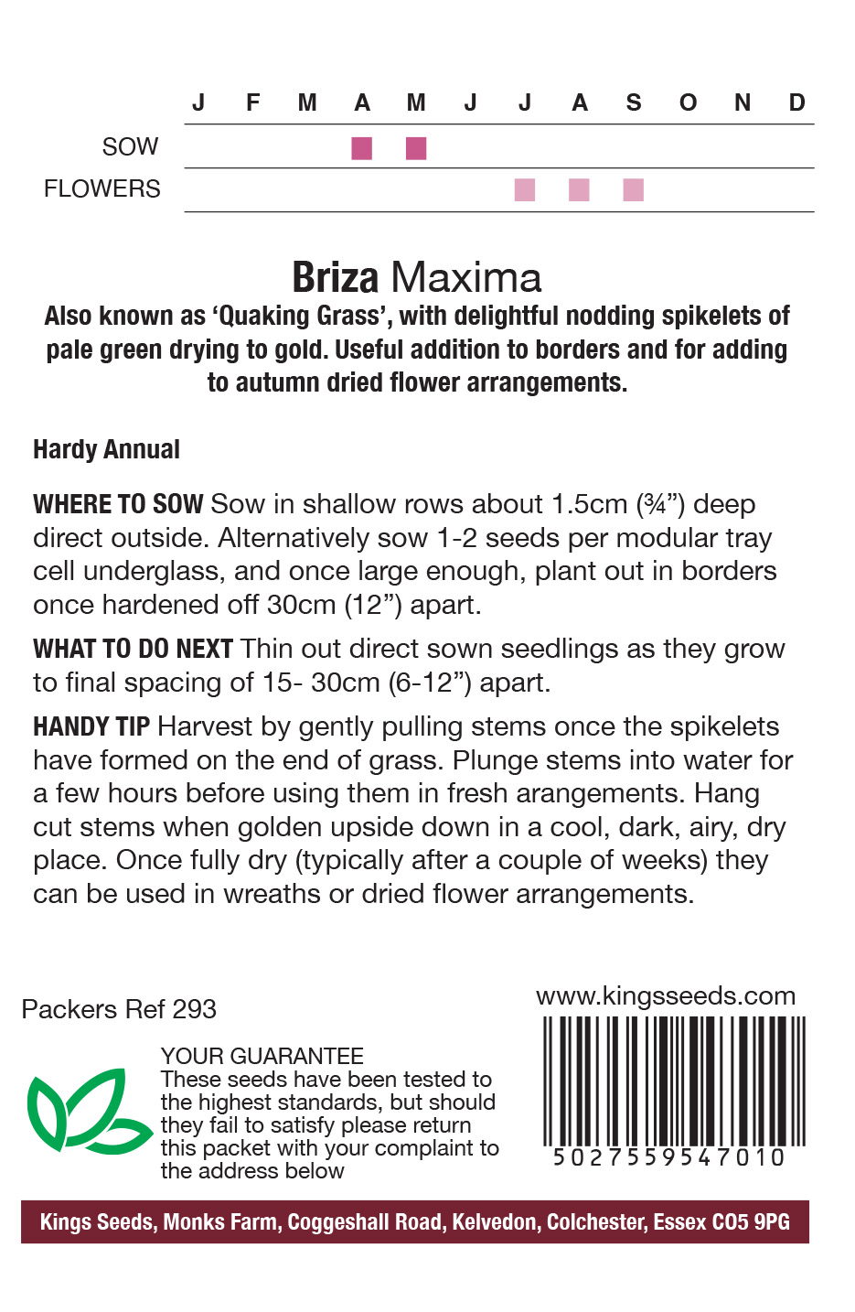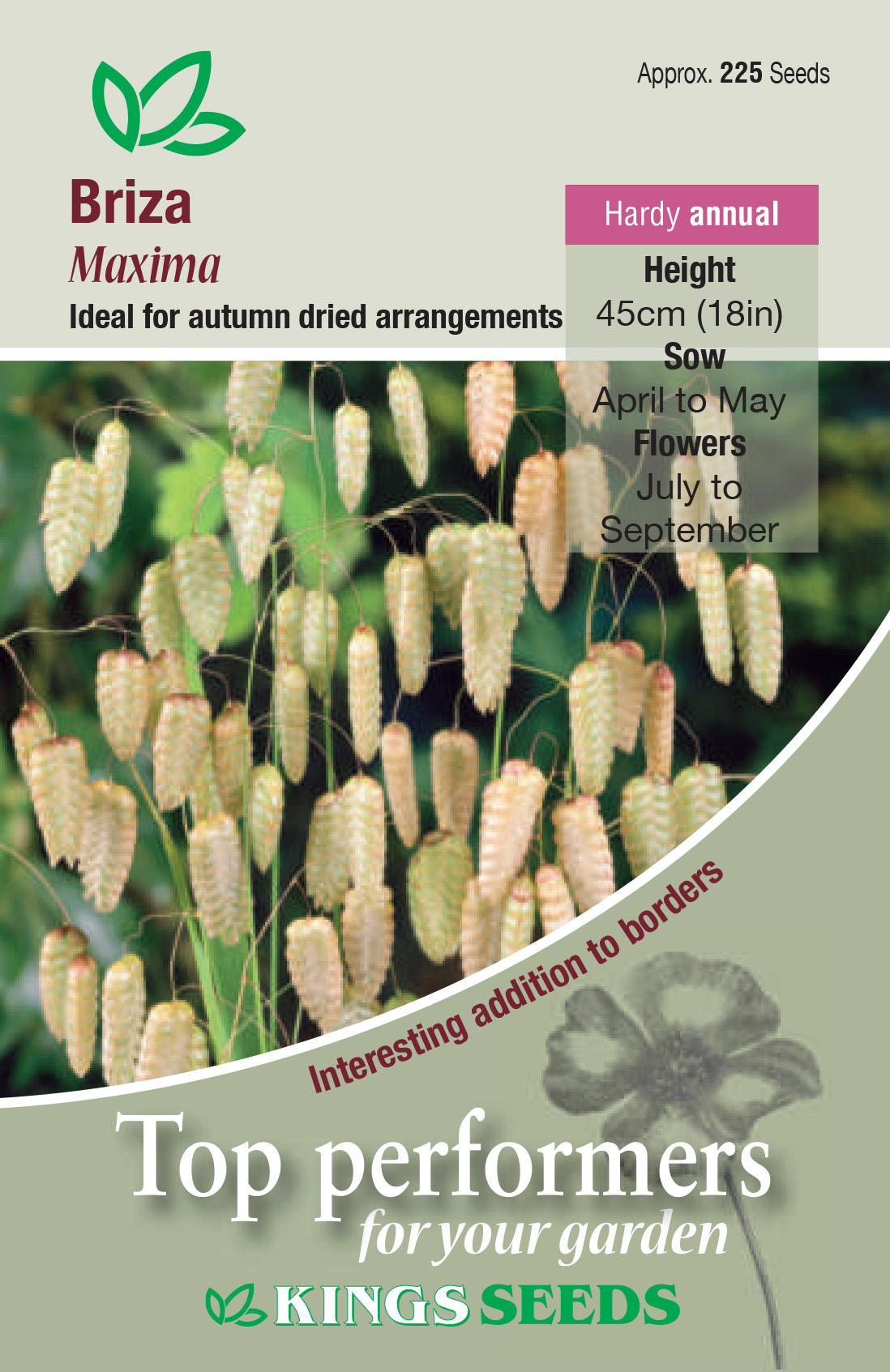 Quaking Grass is an annual ornamental grass with delightful nodding spikelets of pale green drying to gold. Lovely in ever-lasting arrangements.