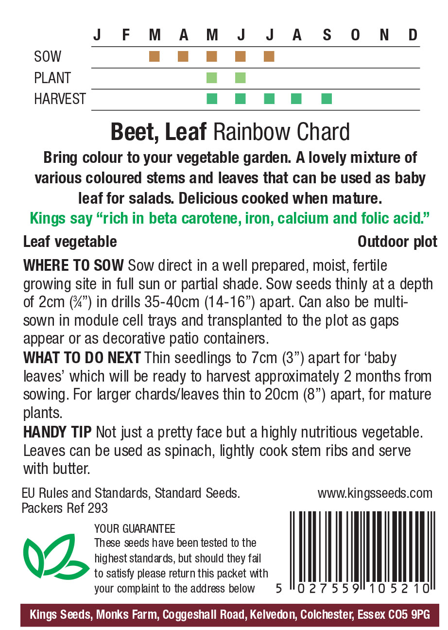 Beta vulgaris. Bring colour to your vegetable garden with rainbow chard! A lovely mixture of various red, orange and yellow coloured stems with leaves that can be used as baby leaf for salads or delicious cooked when fully grown. Rainbow chard is an excellent choice to replace spinach in various recipes, and add a vibrant colour to your dish. These can be slow to bolt but will eventually grow to heights of 45cm and spread to 30-40cm wide.
