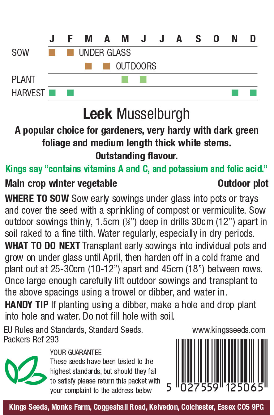 Musselburgh is the most popular variety for its strong growing habit. It is very winter hardy producing thick stems and will be ready from November onwards. A main crop winter vegetable that should be grown on an outdoor plot.