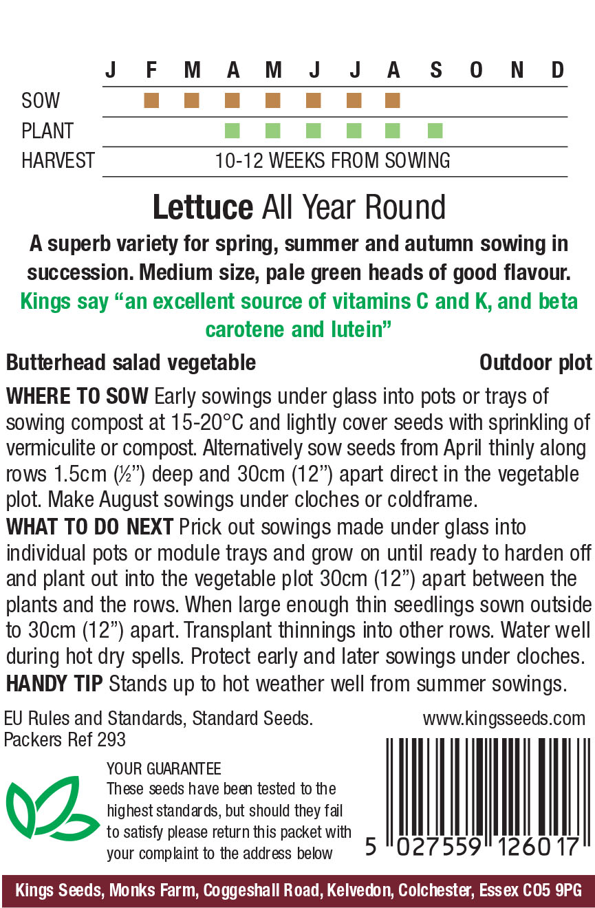 Lettuce “All The Year Round” is a superb variety for spring, summer and autumn sowing in succession. Its a traditional favourite butterhead. They produce medium sized vegetables with a good flavour and nice crisp texture.