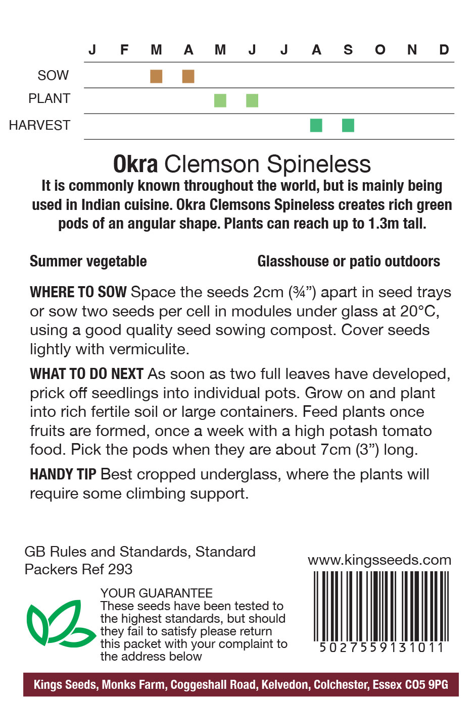 Okra Clemsons Spineless creates rich green pods of an angular shape. The plants themselves can reach up to 1.3m we recommend supporting these with canes.