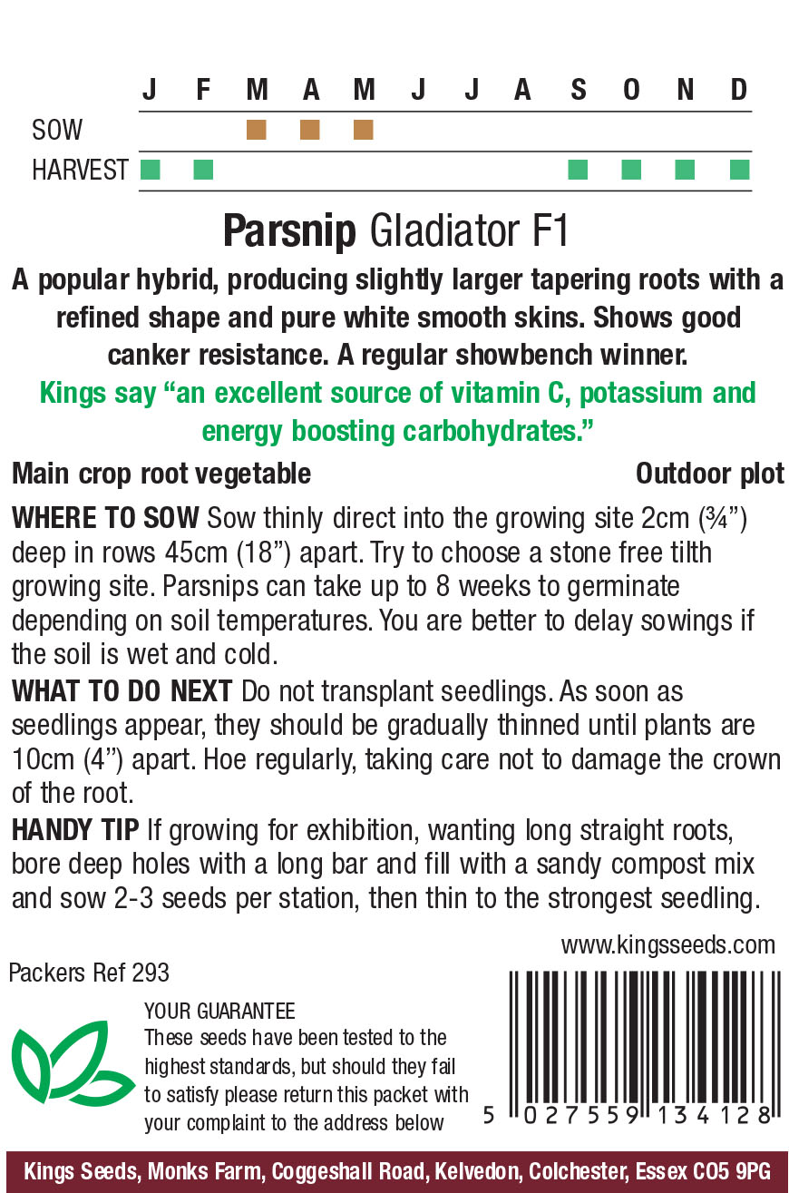Sow thinly direct into the growing site 2cm (¾”) deep in rows 45cm (18in) apart. Try to choose a stone free tilth growing site. Parsnips can take up to 8 weeks to germinate depending on soil temperatures. You are better to delay sowings if soils are wet and cold.