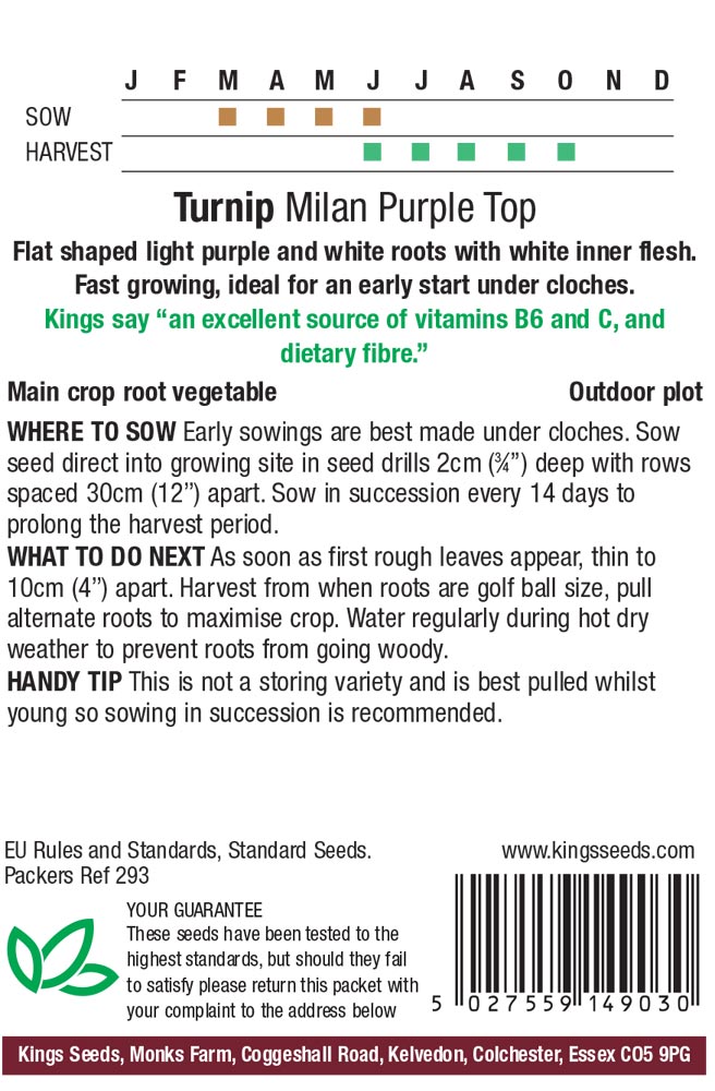 Turnip Milan Purple Top produces flat shaped roots of light purple and white with white flesh within. It is a fast to mature variety and is ideal for an early start under cloches. These turnips can be eaten when they are small and tender, as this is when they will have the best flavour.