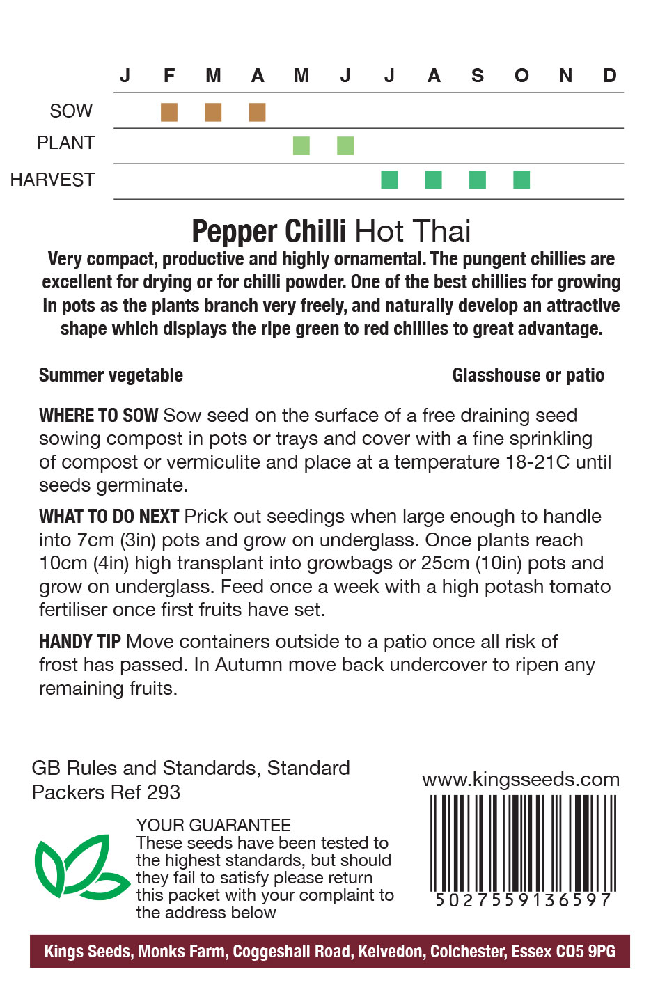 Hot Thai is a very compact, productive and highly ornamental. The pungent chillies are excellent for drying or for chilli powder. One of the best chillies for growing in pots as the plants branch very freely, and naturally develop an attractive shape which displays the ripe green to red chillies to great advantage.