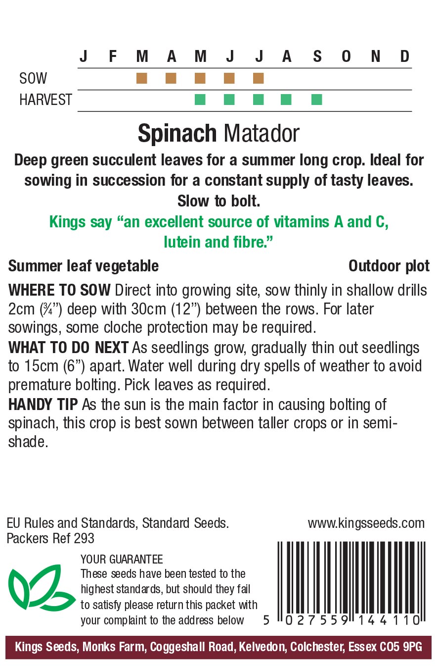 Spinach Matador – Deep green succulent leaves for a summer long crop. Ideal for sowing in succession for a constant supply of fresh leaves. A slow bolting variety.